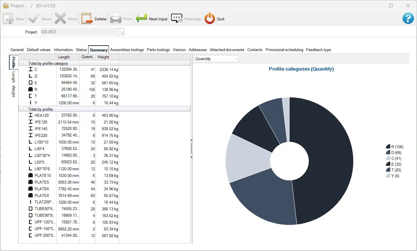 Get quick access to all useful data to have an overview of the project and help in decision making: name of the project, customer, weight, surface, person in charge, expected delivery date, distribution by profile type, tooling operations required by type, grades, etc.