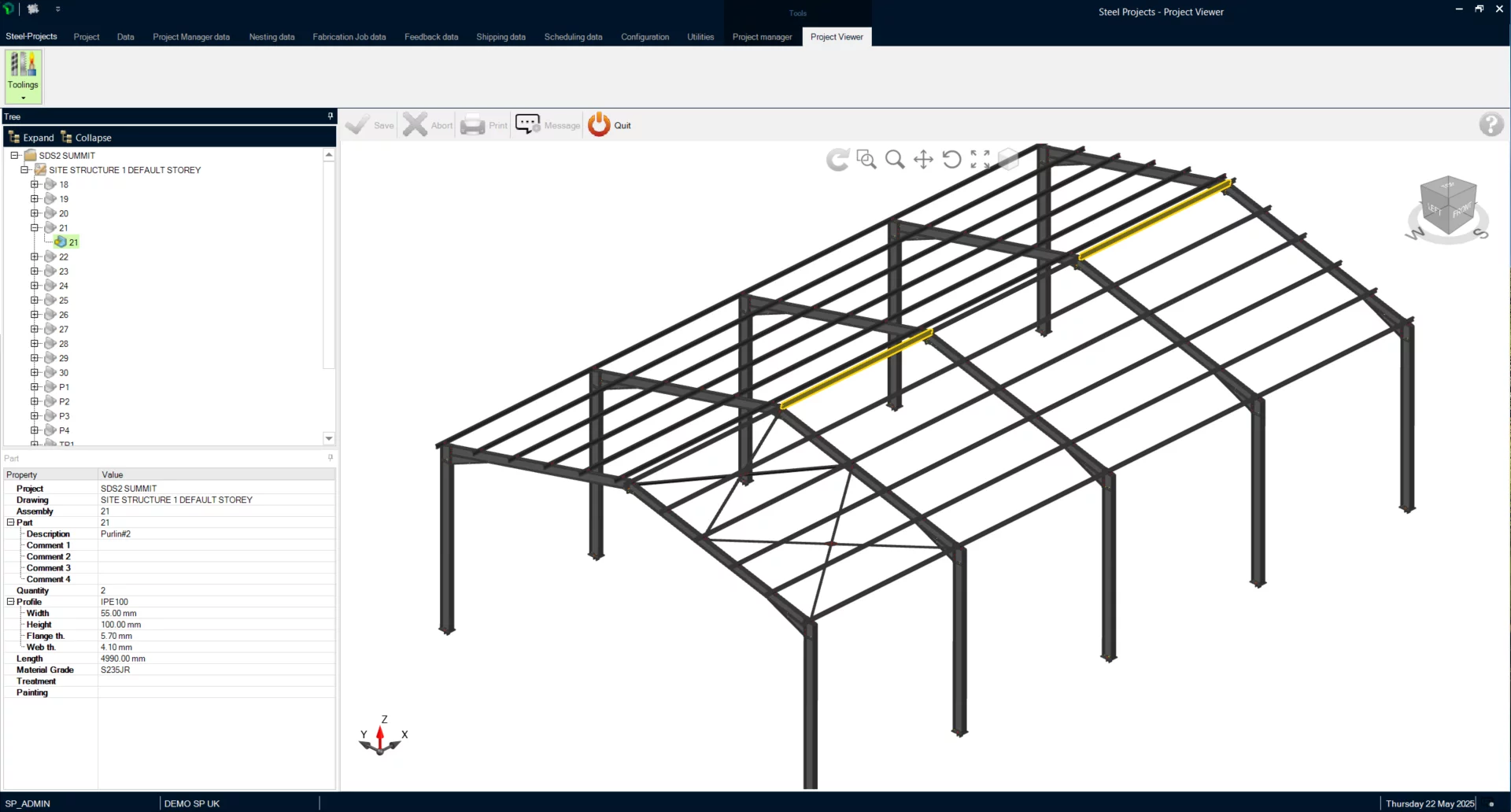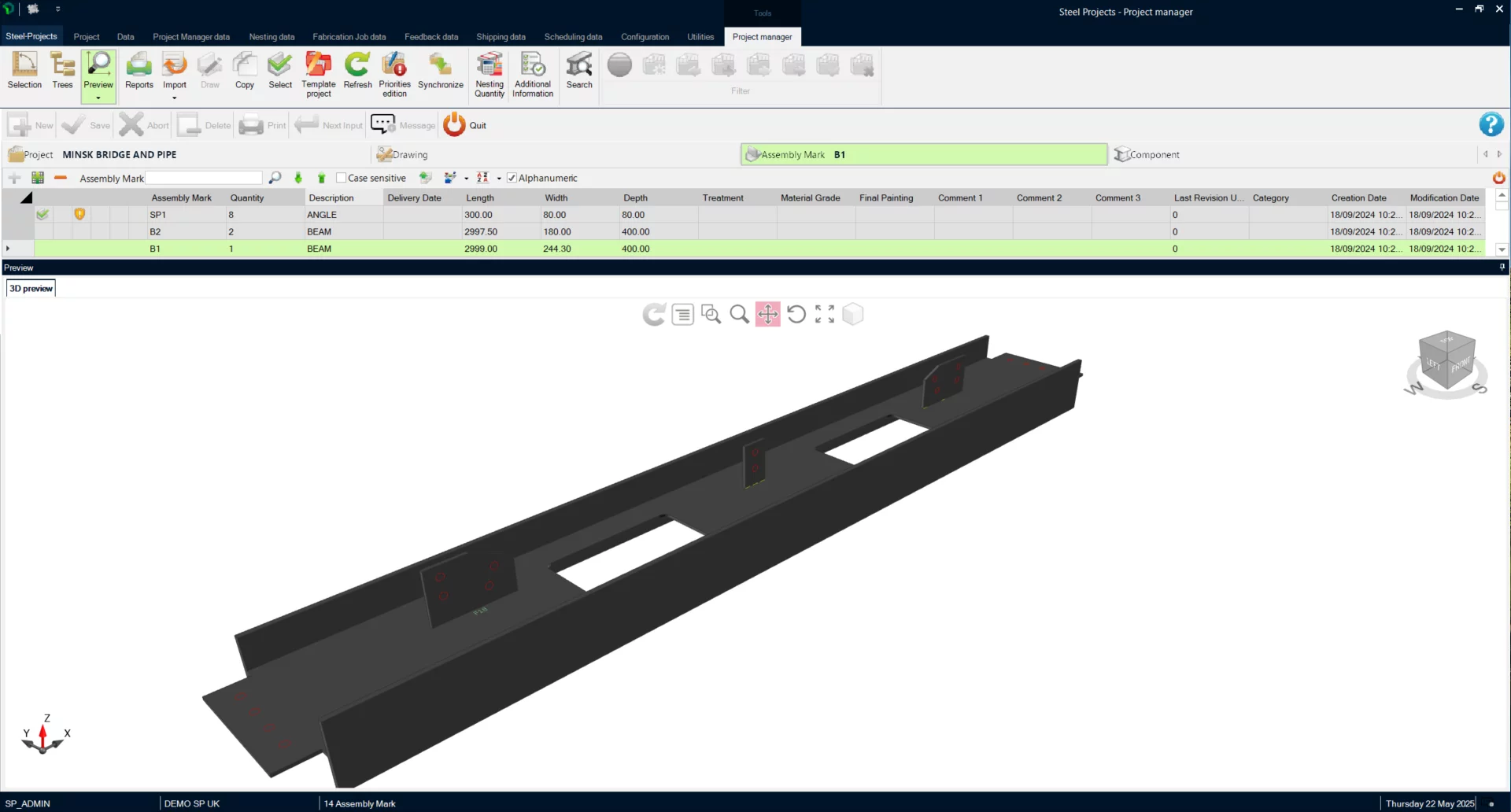 Find under this interface the project nomenclature as it was imported from the drawing software: contract / project / phase / assembly / secondary part.