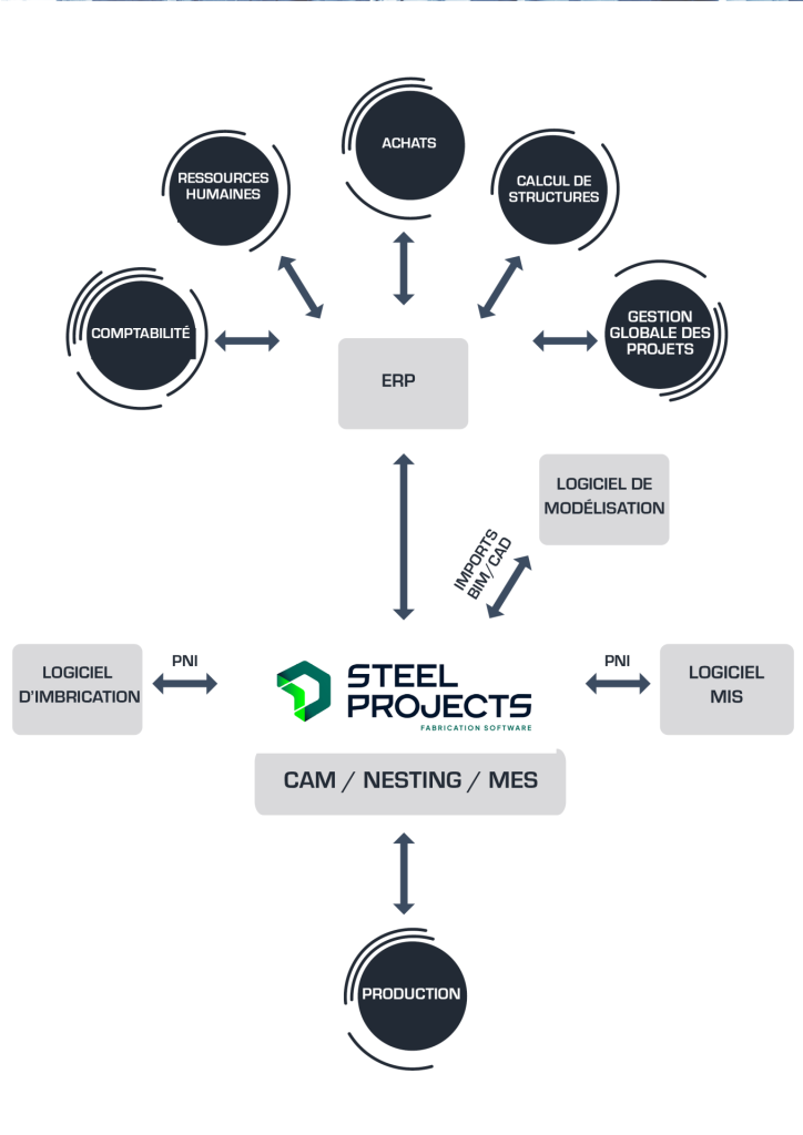 Le diagramme suivant résume les différents échanges qui peuvent avoir lieu entre Steel Projects et des logiciels externes tout au long du processus. L'objectif pour nos clients est d'atteindre une continuité numérique totale, essentielle pour optimiser leurs processus et réaliser ainsi des gains de productivité significatifs. Enfin, cela permet de tirer le meilleur parti de chaque logiciel et de leurs possibilités.